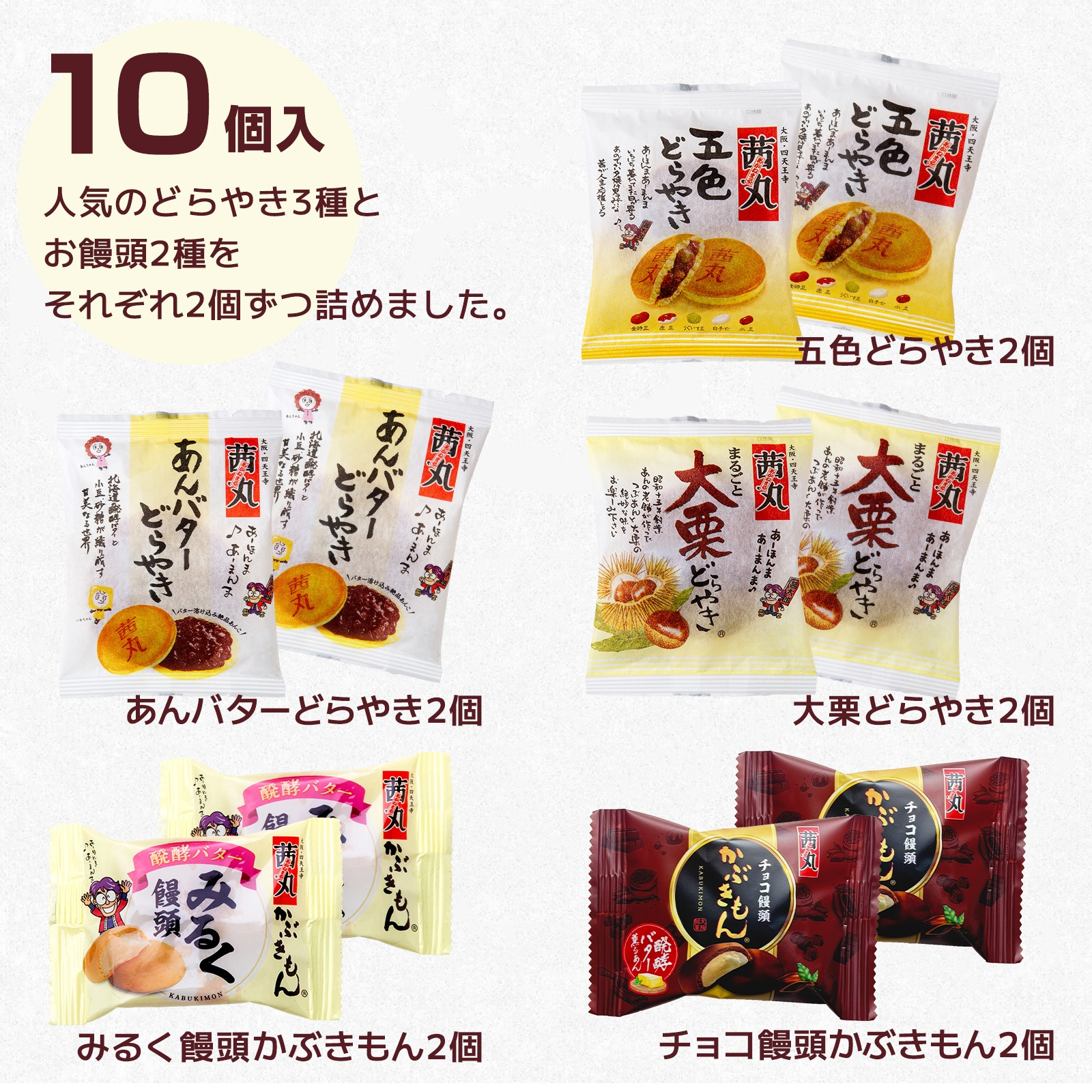 茜丸の定番どらやきを気軽に試したい人には、こちらの10個入りセットがちょうどいい内容。人気のどらやき数種類に加えて、かぶきもんシリーズも一緒に入っていて、味のバリエーションを一度に楽しめます。価格は税込・送料込みで2,120円と、家庭用としてはかなり手に取りやすい印象です。