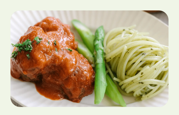鉄分を意識して作られた、レバー入りのミートボールのトマト煮だ。栄養面を重視しながらも、味わいとのバランスに配慮された設計になっている。