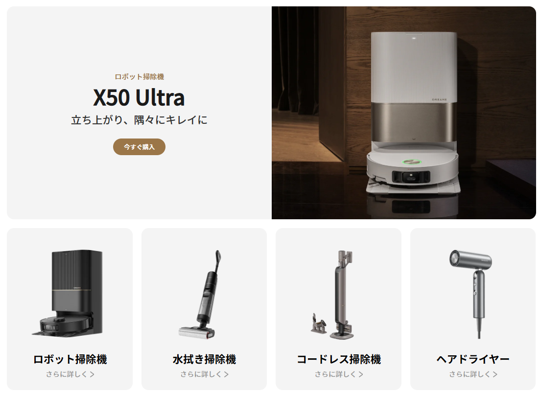 日本市場には2023年から本格参入し、まずは自動ゴミ収集機能付きロボット掃除機をオンラインで展開しました。その後、家電量販店での取り扱いも広がり、上位モデルのロボット掃除機や新しい発想の水拭き掃除機が実店舗でも販売されています。海外の展示会や専門メディアで評価を受けた最上位モデルも投入されており、今後も高性能モデルや新技術を取り入れた製品の展開が予定されているブランドです。