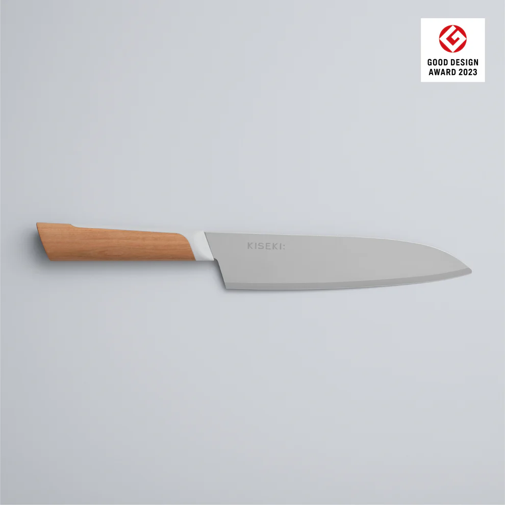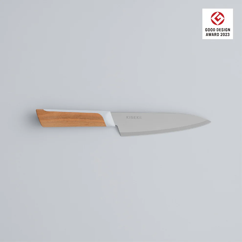 製造は、刃の加工から仕上げまで岐阜県関市の自社工場で行われています。木柄には岐阜県産の広葉樹を使用し、口輪も地元企業と共同開発するなど、地域の技術が集められています。KISEKI:という名前には、「関の技術が輝く包丁でありたい」という思いが込められているそうです。
