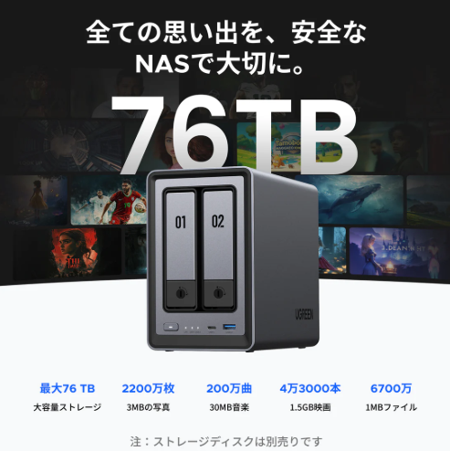 SATA 2ベイに加えてM.2を2ベイ増設でき、最大76TBまで拡張できる“家庭用のデータ保管庫”として設計されたNASです。写真なら約2,656万枚(1枚3MB換算)、一般的なファイルなら約7,969万件、動画なら約51,883本(1本1.5GB換算)まで保存できる計算なので、スマホの写真・動画はもちろん、パソコンやタブレットのデータ、仕事の資料までまとめてバックアップ先を一本化できます。保存したデータは、必要なときにどの端末からでも安全に取り出せる運用を想定しています。※HDDは別売です。
