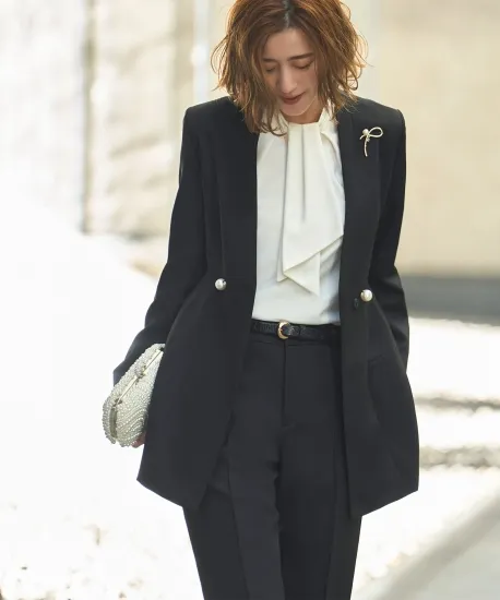 異素材の組み合わせによって奥行きのある表情を持たせた、パンツタイプのセットアップです。ディテールにこだわったオーガンジー素材の袖が、全体を軽やかで上品な印象にまとめています。着丈はやや長めで、全体的にゆとりのあるシルエットのため、気負わず着用できる点も魅力です。きちんと感がありながら堅くなりすぎず、式典などのフォーマルな場面にも対応しやすい一着として紹介されています。