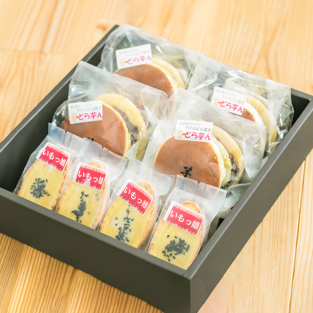 どら芋ん4個、いもっ娘4個を詰め合わせた、お芋好きにはうれしいギフトセットです。和の味わいと洋の味わいをどちらも楽しめる内容で、贈りものとしてはもちろん、自宅用にも選びやすい組み合わせになっています。